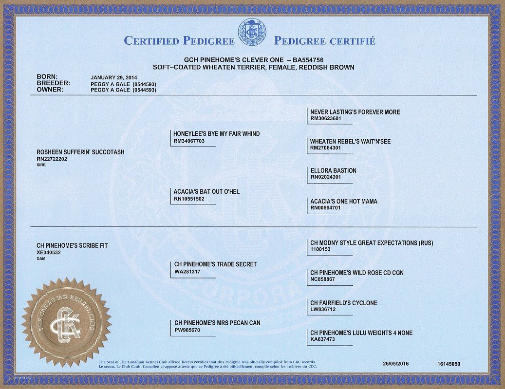 Pedigree for 'Cleo' GCH Pinehome's Clever One